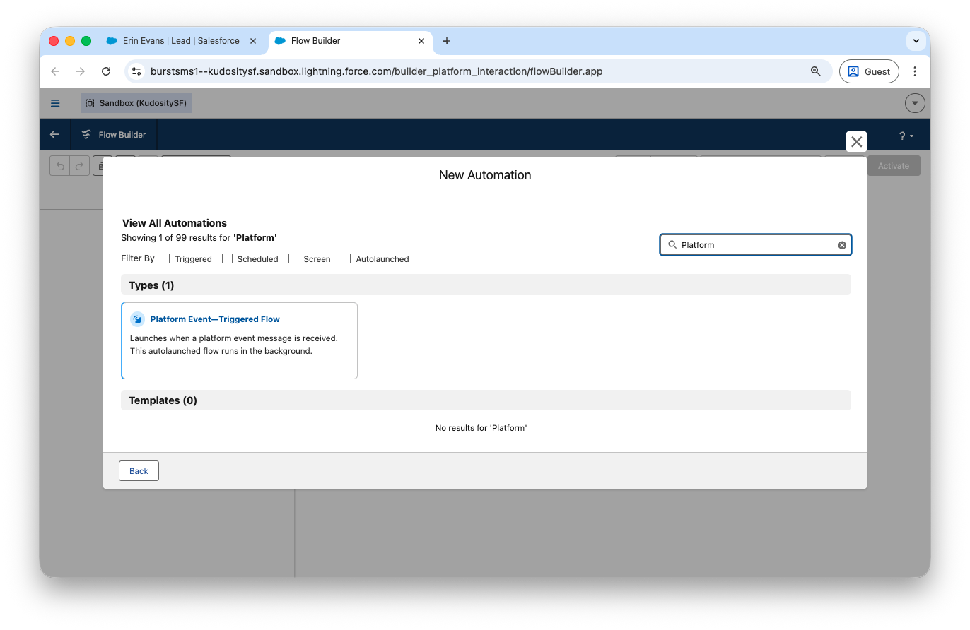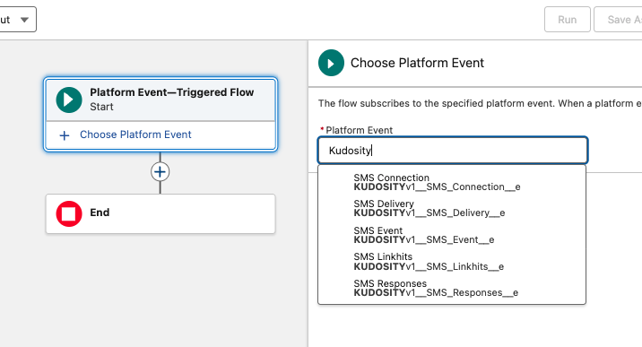 Kudosity's Salesforce integration lets you trigger SMS messages automatically from within Salesforce Flows. SMS replies and link clicks can also fire Platform Events back into Salesforce, enabling fully automated, event-driven messaging sequences.