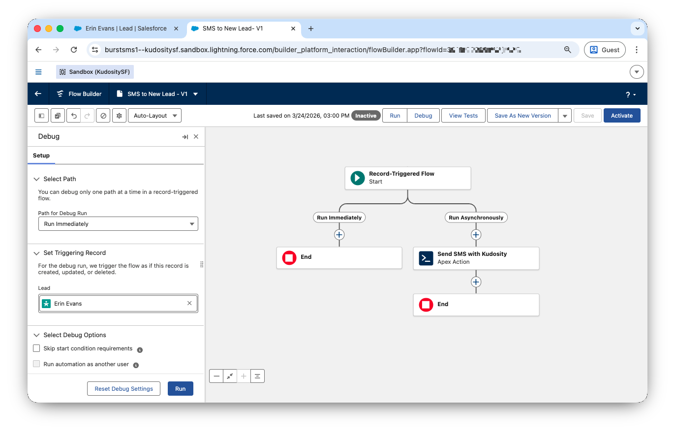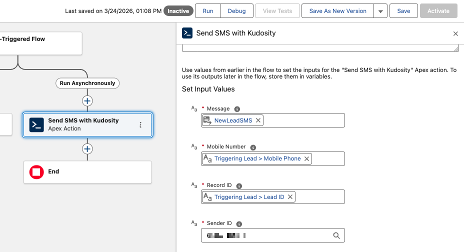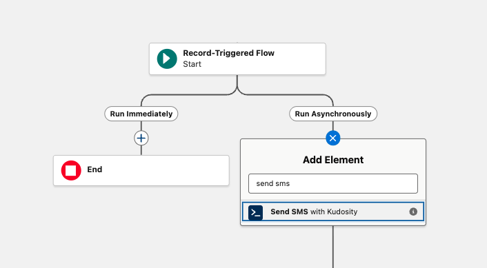 Important: The Kudosity SMS action in Flows must be configured to run asynchronously. Setting the action to run synchronously will cause the Flow to fail.