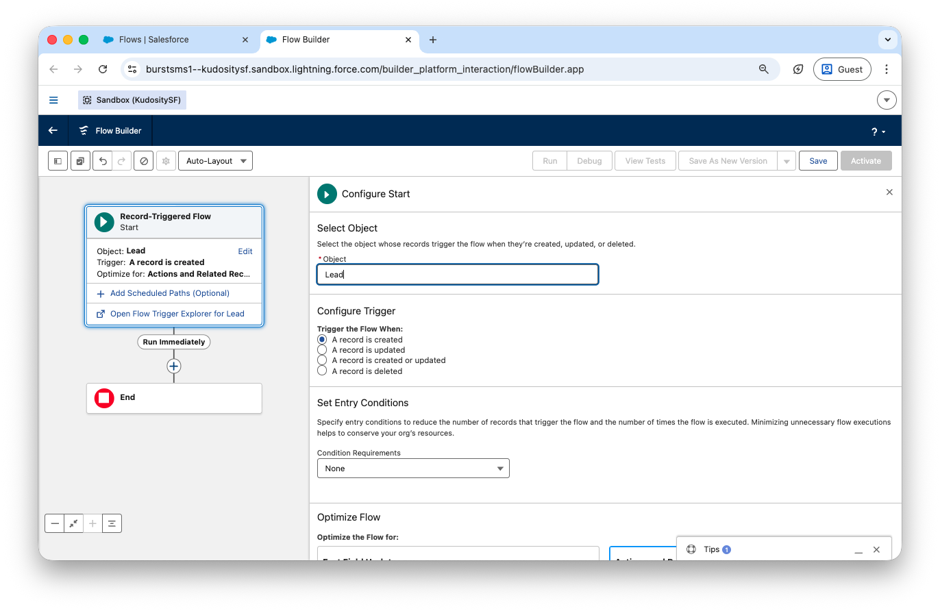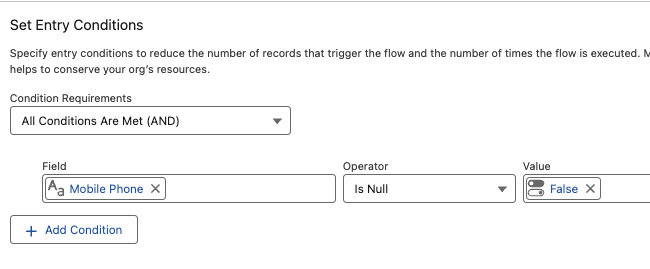 Add an Entry Condition: Mobile Phone — Is Null = False. This ensures only leads with a mobile number trigger the Flow.
