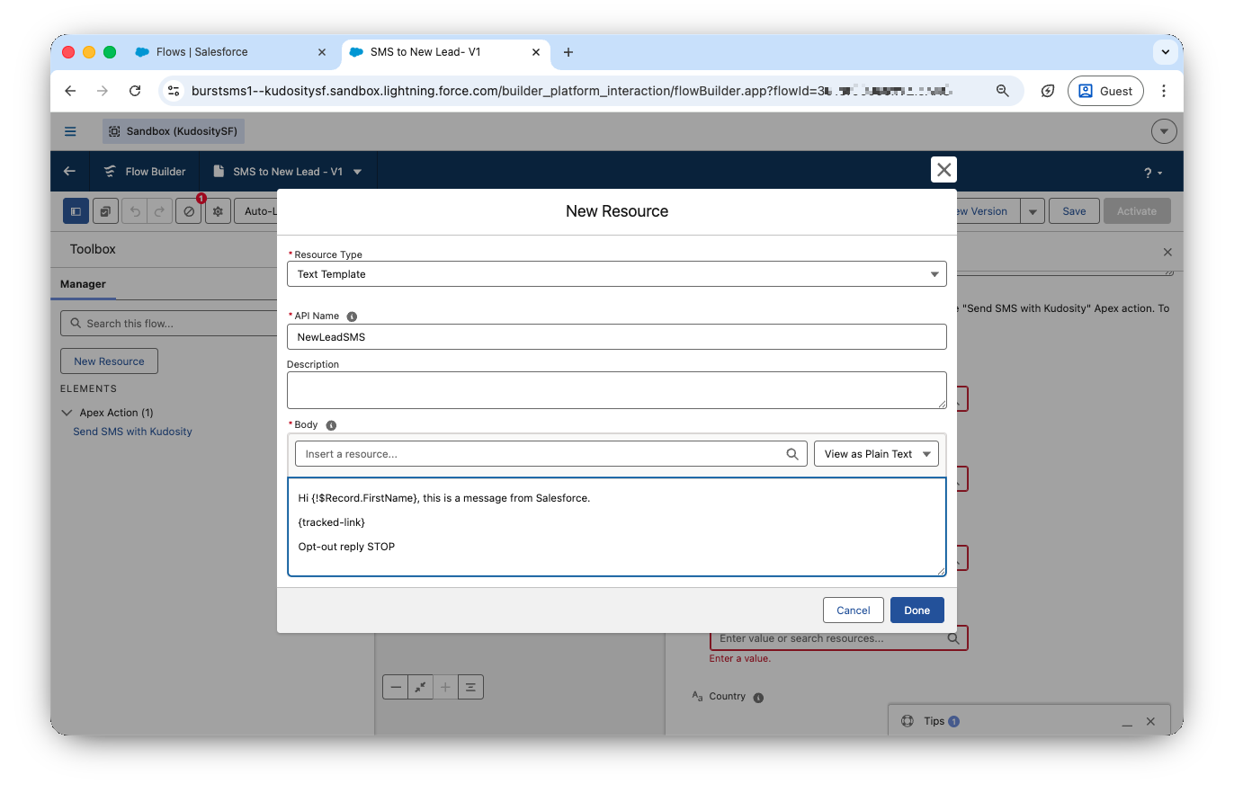 Kudosity.Select Send SMS with Kudosity (SMS Action Apex Class).