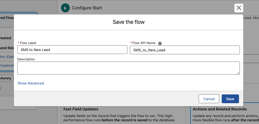 Give your Flow a label and API name, for example SMS to New Lead / SMS_to_New_Lead.