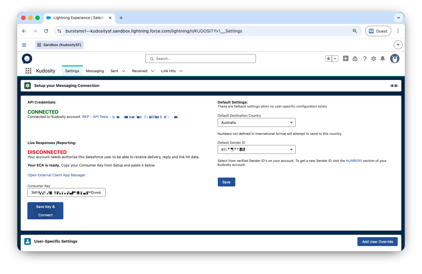 Consumer Key field disappears after clicking Open App Manager | The system detected an existing Connected App session — refresh the Kudosity setup screen and check if Live Responses now shows CONNECTED |