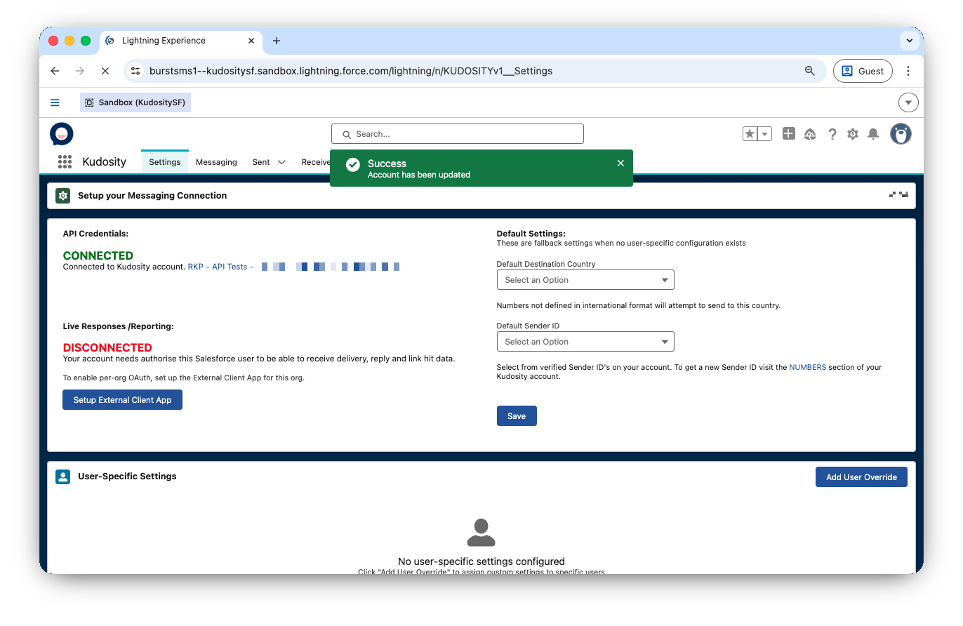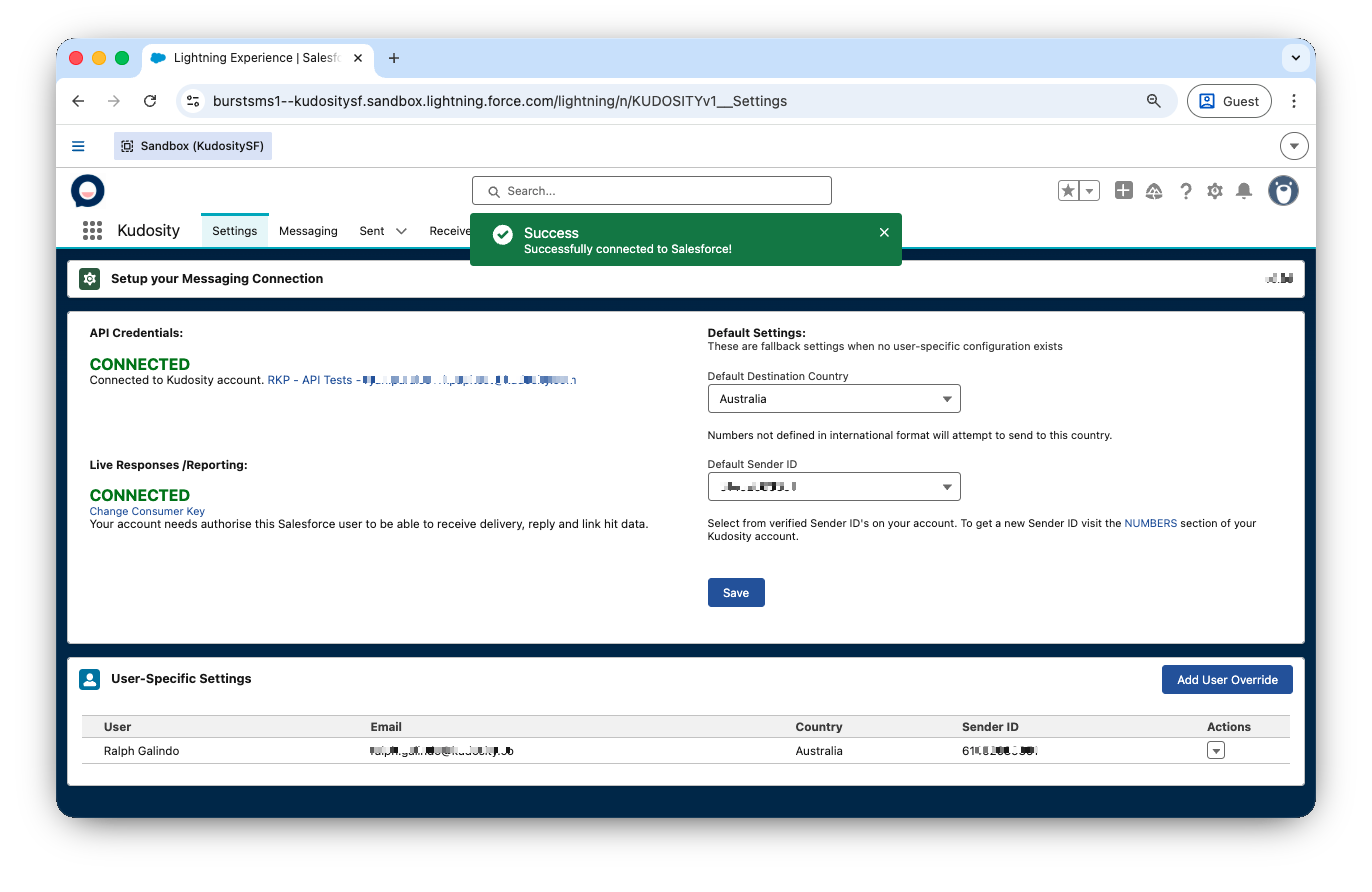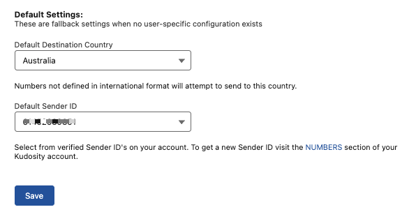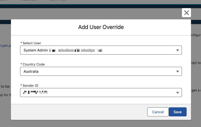 Administrators can assign specific default Sender IDs and Country settings to individual Salesforce users. This ensures users only have access to the Sender IDs appropriate for their role and prevents users from accessing Sender IDs assigned to other team members.