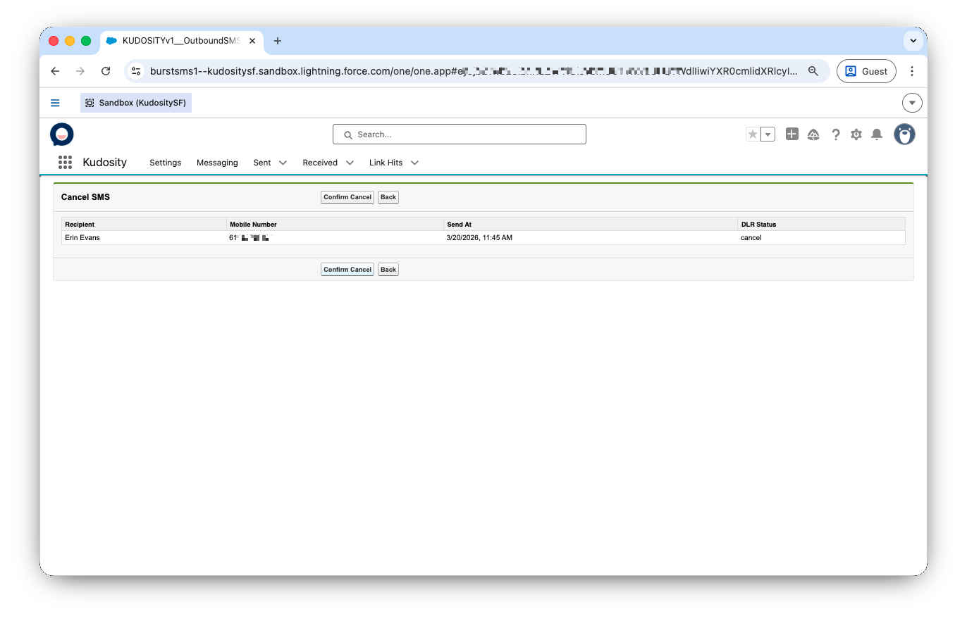 To cancel a scheduled message: select it from the Sent tab → click Cancel SMS → confirm cancellation.