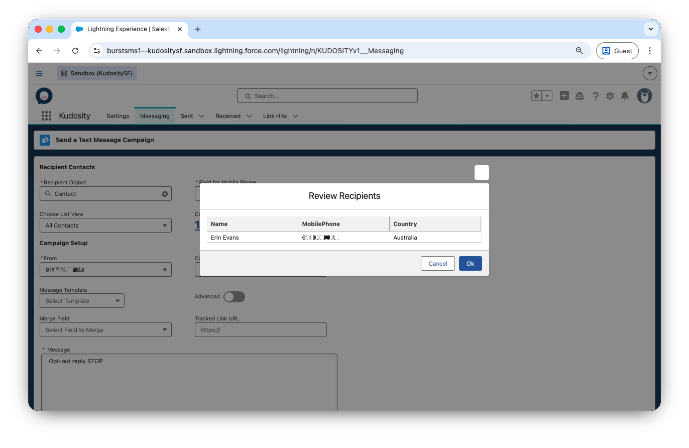 Send bulk SMS campaigns directly from Salesforce to any object, any list view, with personalisation and delivery tracking.