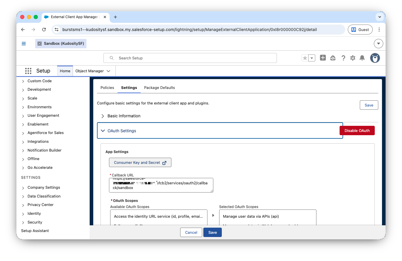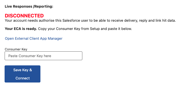This step enables live delivery reporting, inbound replies, and link hit notifications back into Salesforce. This uses Salesforce's External Client App (ECA) framework.