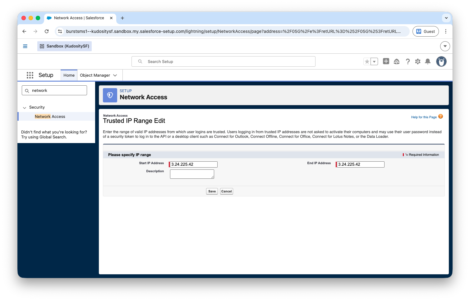 54.66.106.87Navigate to Setup → Security → Network Access, then under Users/Profiles click Login IP Ranges and add the addresses above.
