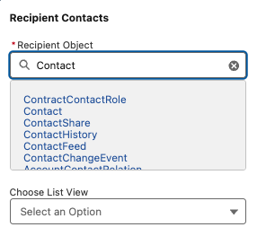 Recipient Object — define your recipient object by typing the object name, for example Lead, Contact, Campaign, or Opportunity.