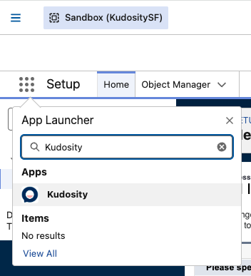 1. Open the App Launcher (9-dot grid icon, top-left navigation bar) and search for Kudosity.