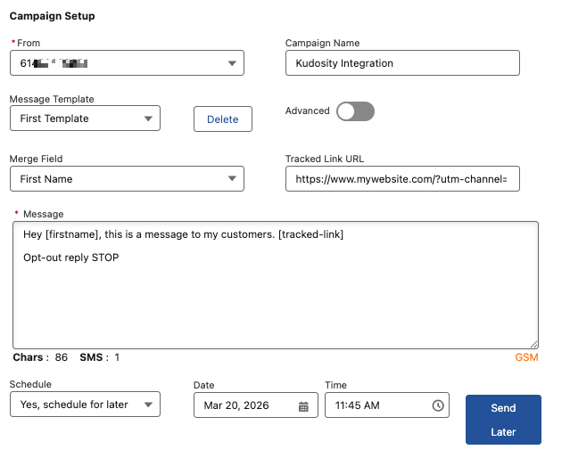 You will need an active, funded Kudosity account with a verified Sender ID to get started.